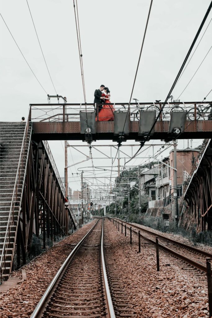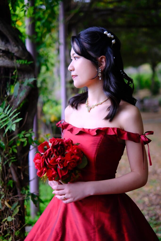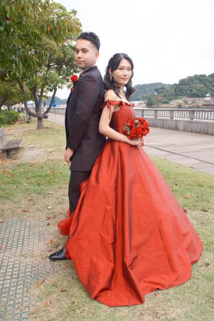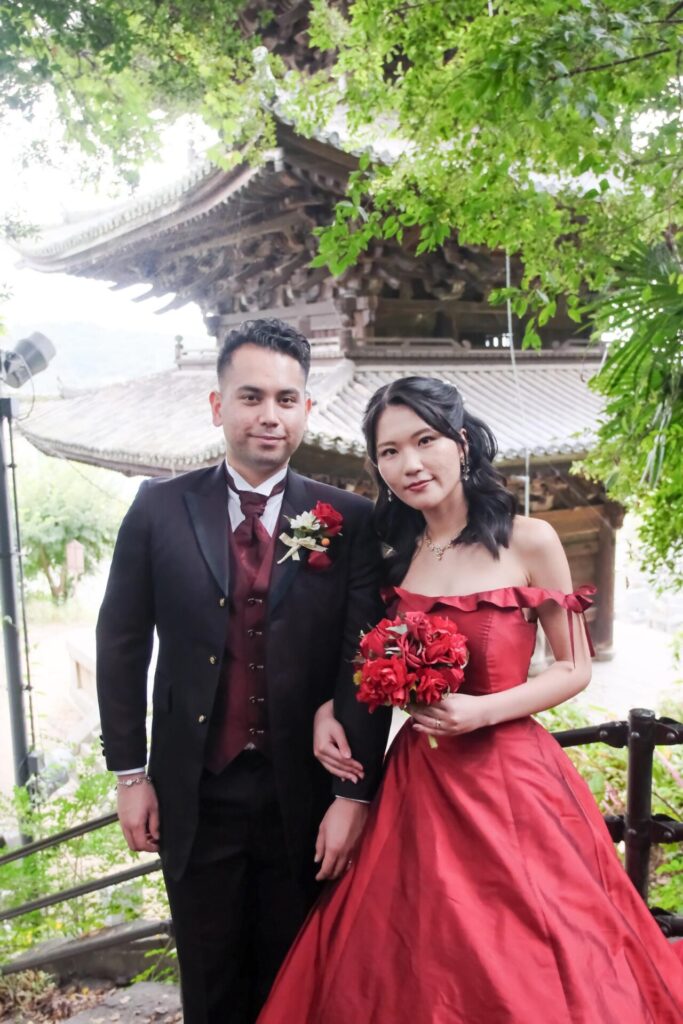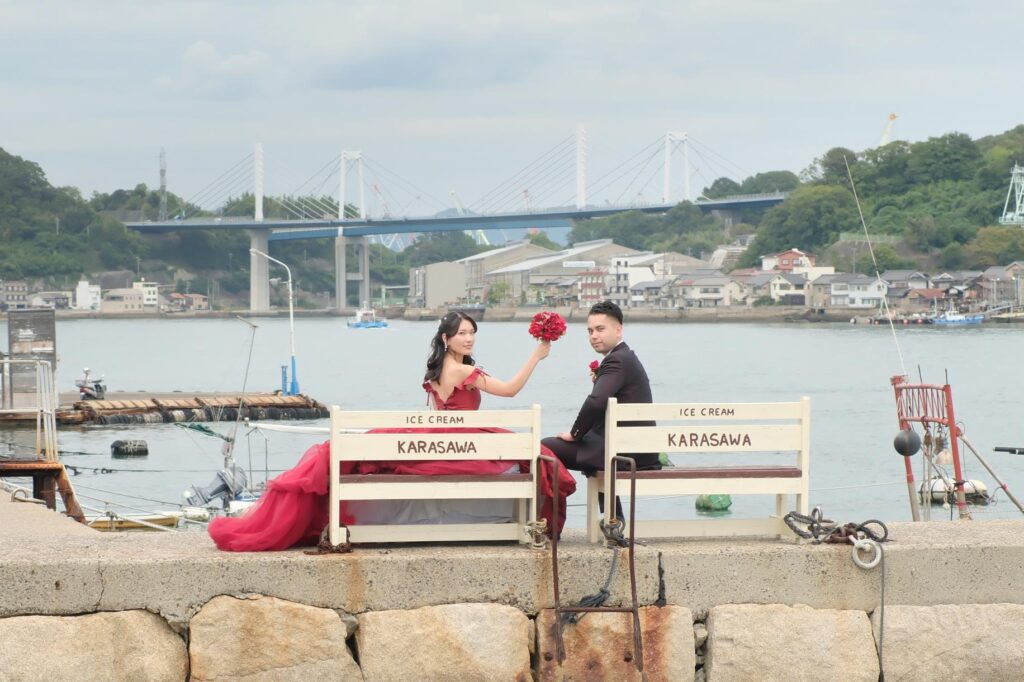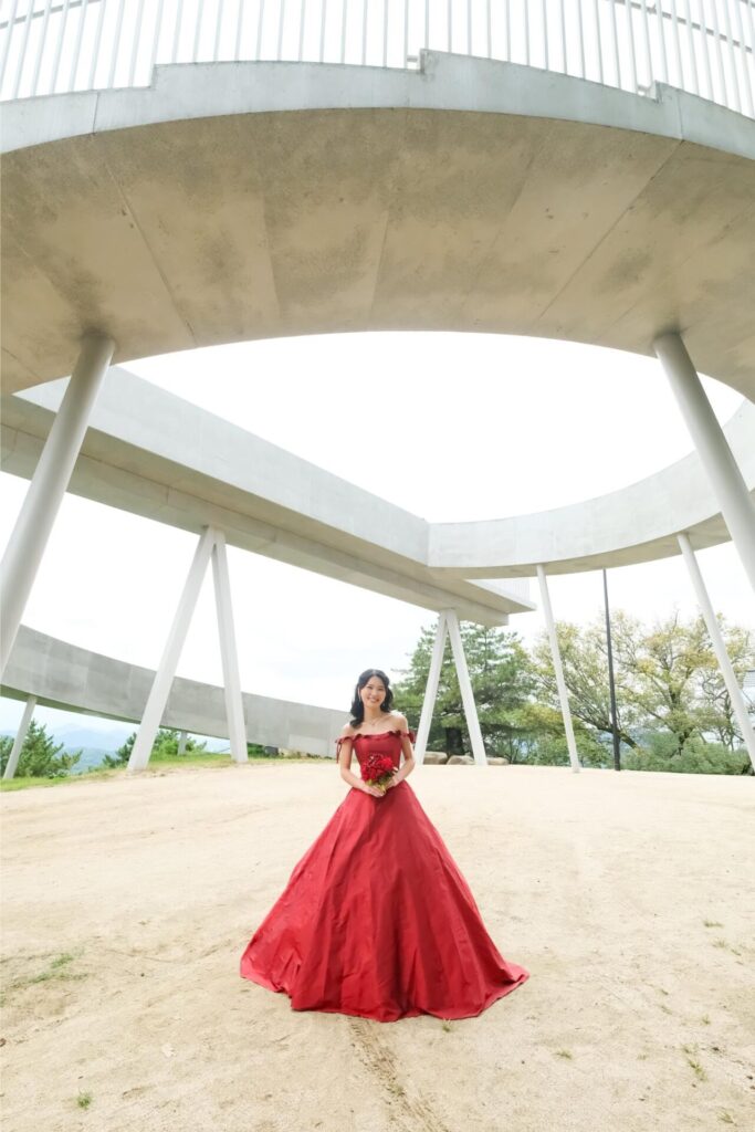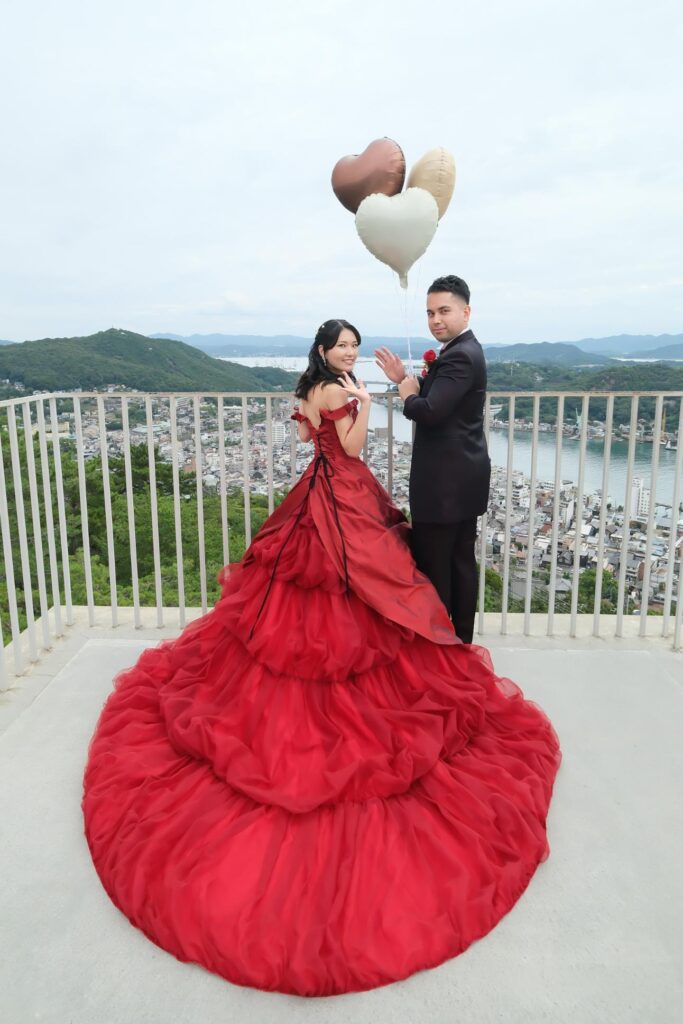 関東在住のマークさんと理子さん。福山で生まれ育った理子さんにとって尾道は学生時代を過ごした特別な街。マークさんは交際中に初めて尾道に訪れてゆったりとした落ち着く雰囲気がとても気に入りました。ふたりが大好きな尾道でワインレッドのドレスで前撮りをしたいという想いを実現しました。