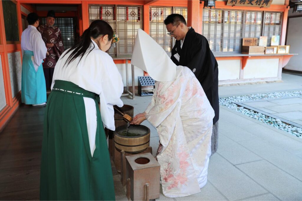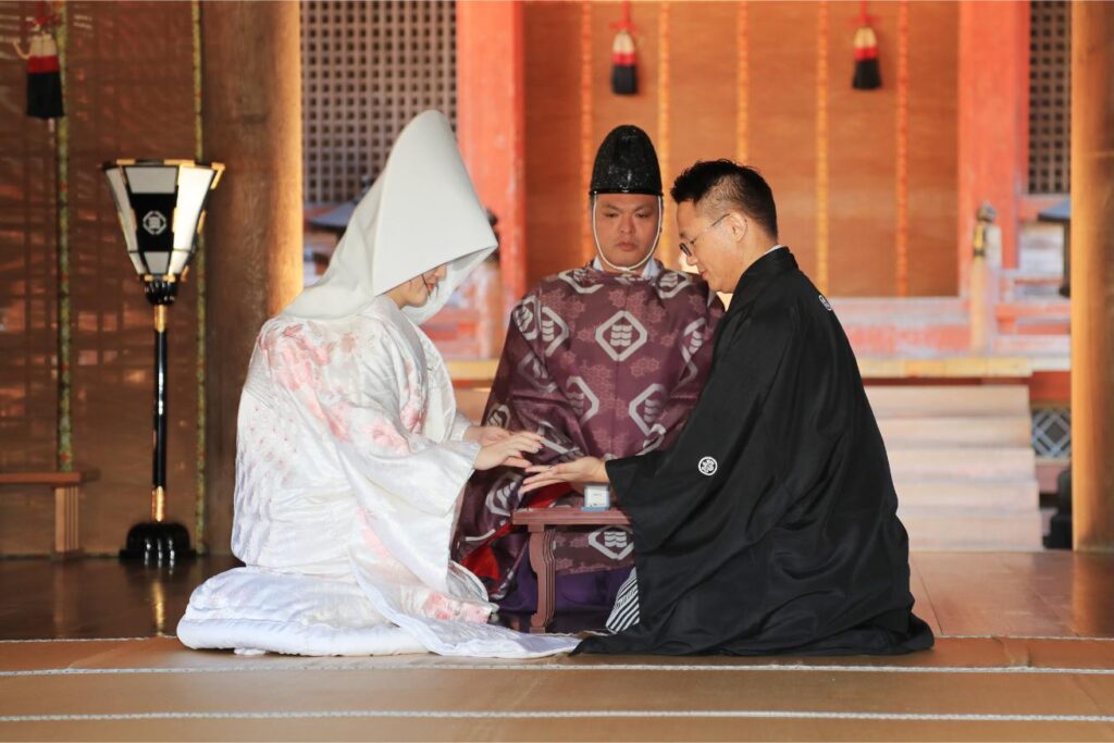 神酒で三々九度の盃を飲み交わす参献の儀