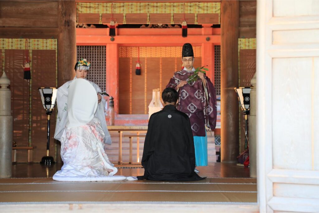 ふたりが末永く幸せに過ごせるように神様にお力添えを祈願する斎主による祝詞奏上