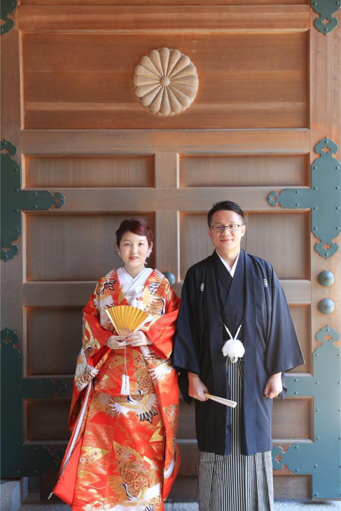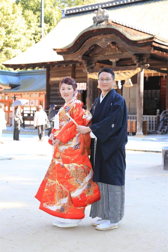 お色直しをして境内で撮影