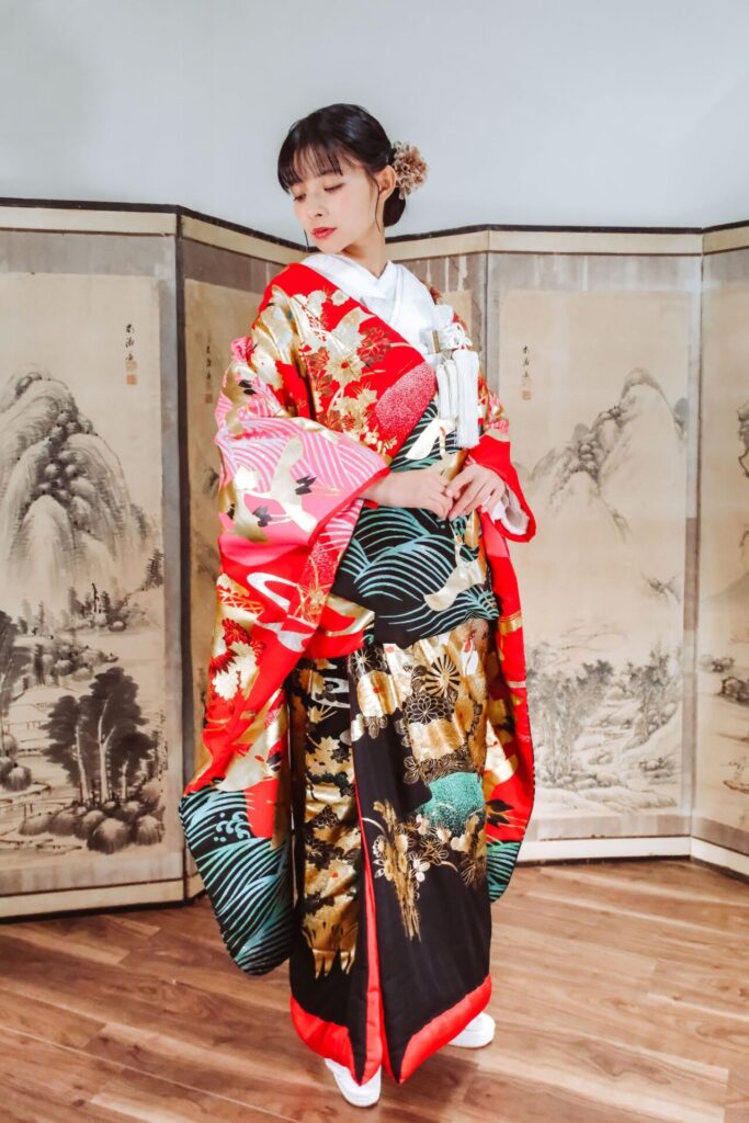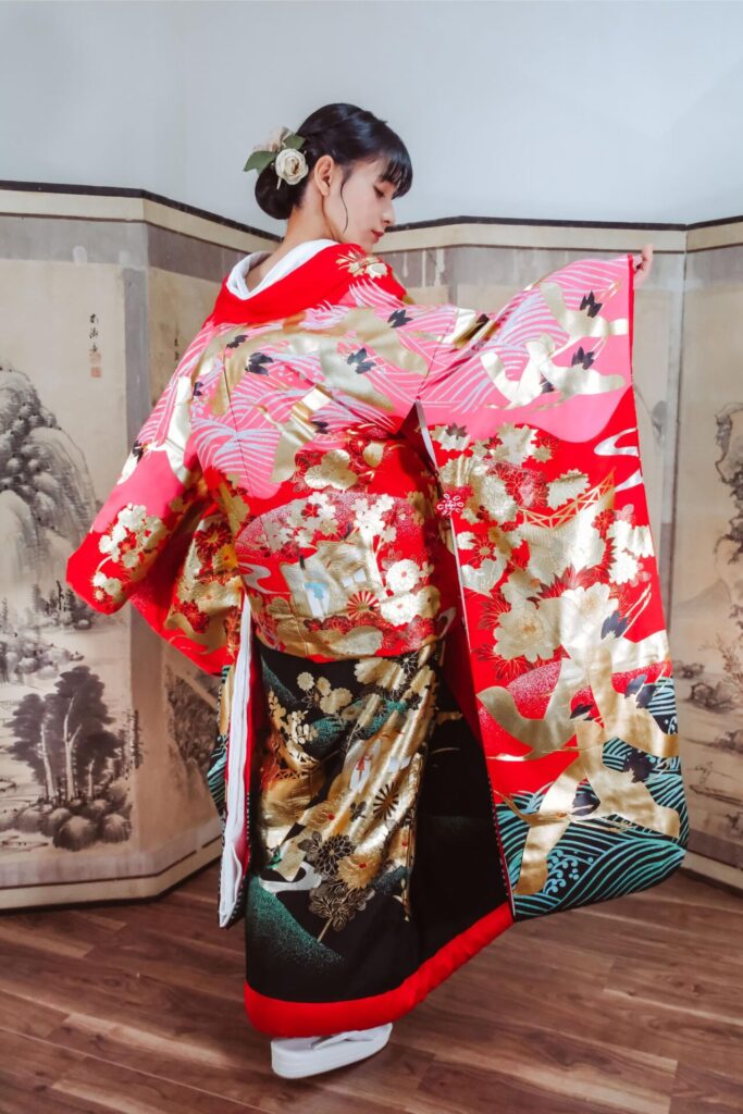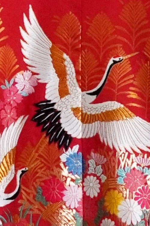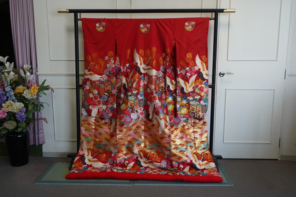 赤を背景に鶴が飛翔する華やかな打掛。