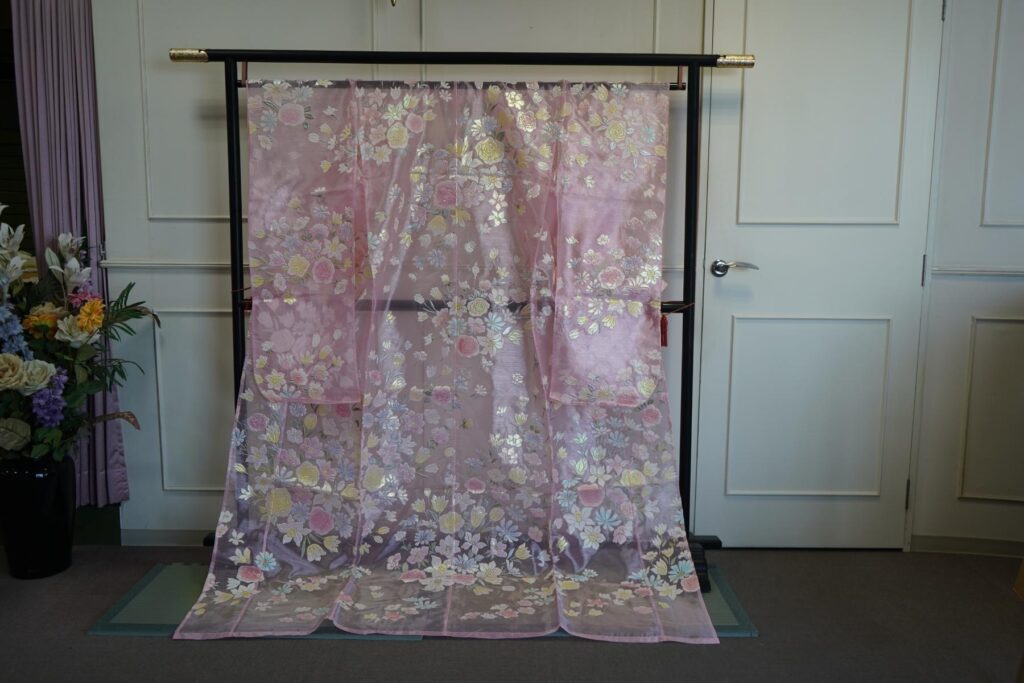ピンクのレースに花柄模様がふんわり可愛らしい打掛。軽く動きやすいのも特徴。