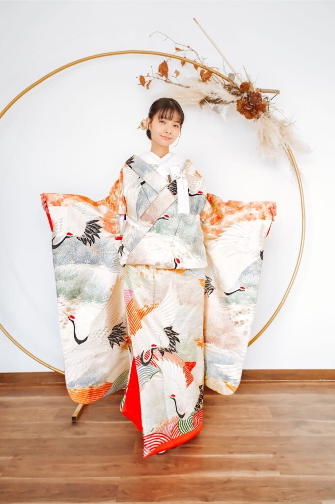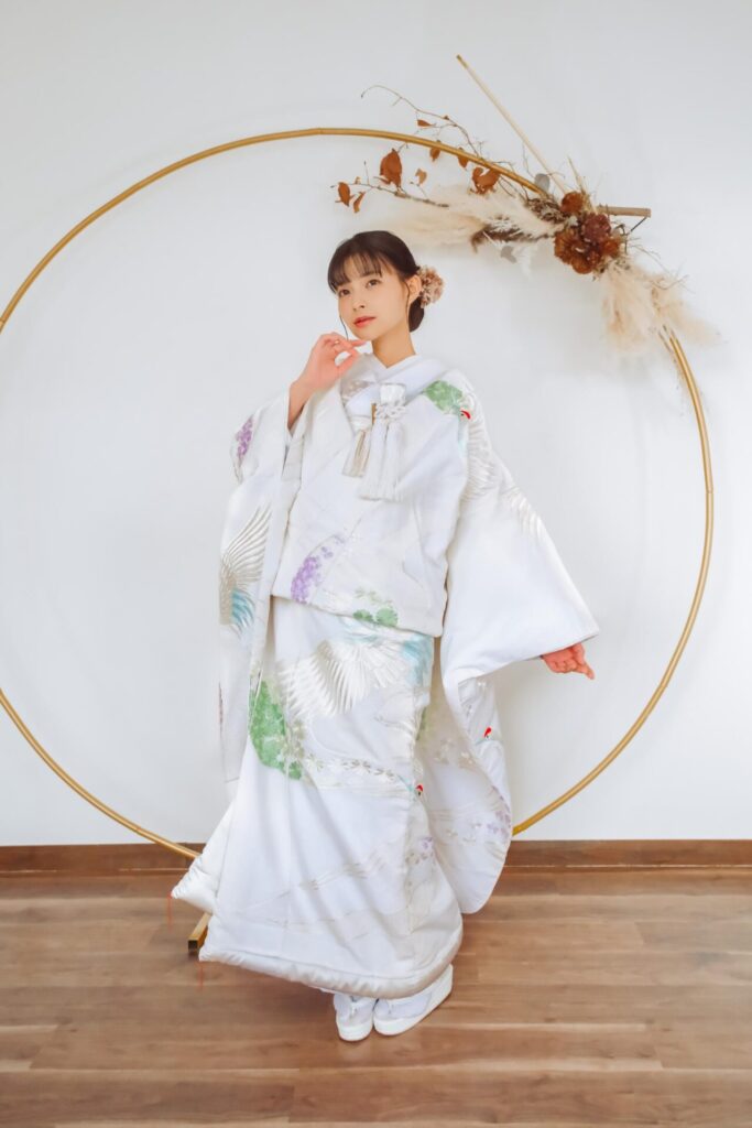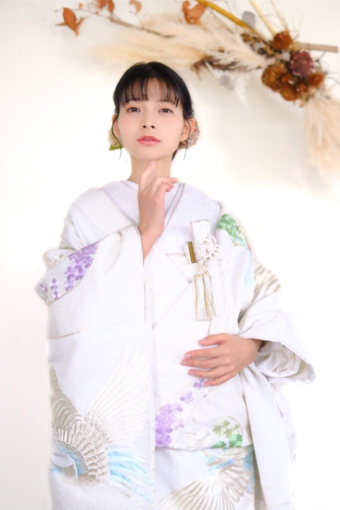 白無垢に鶴が羽ばたいた上品な刺繍と花の色柄。挙式で映える打掛。